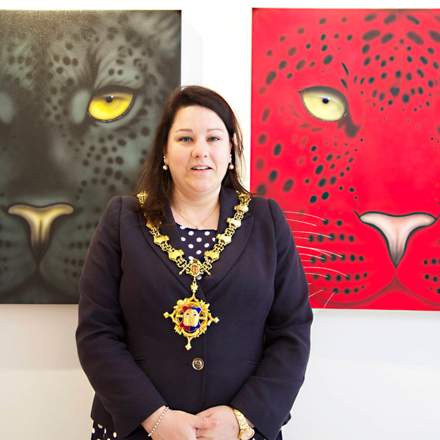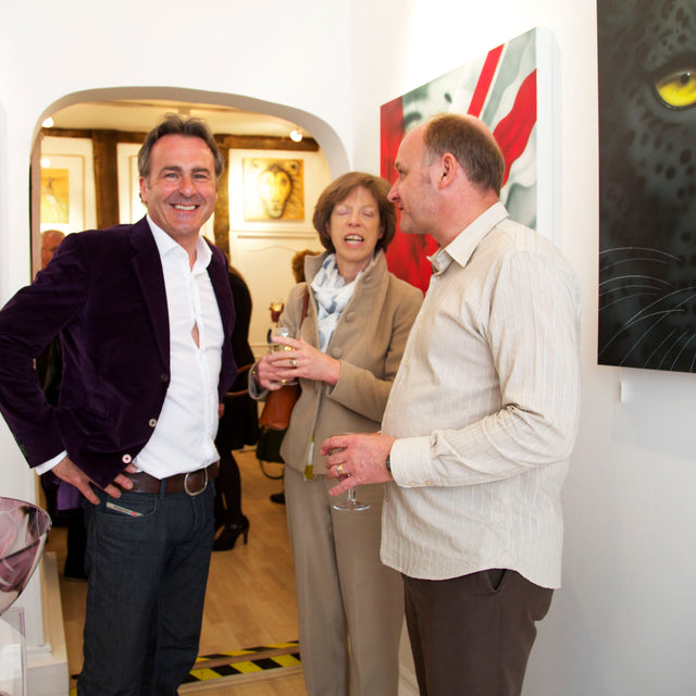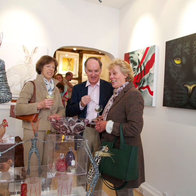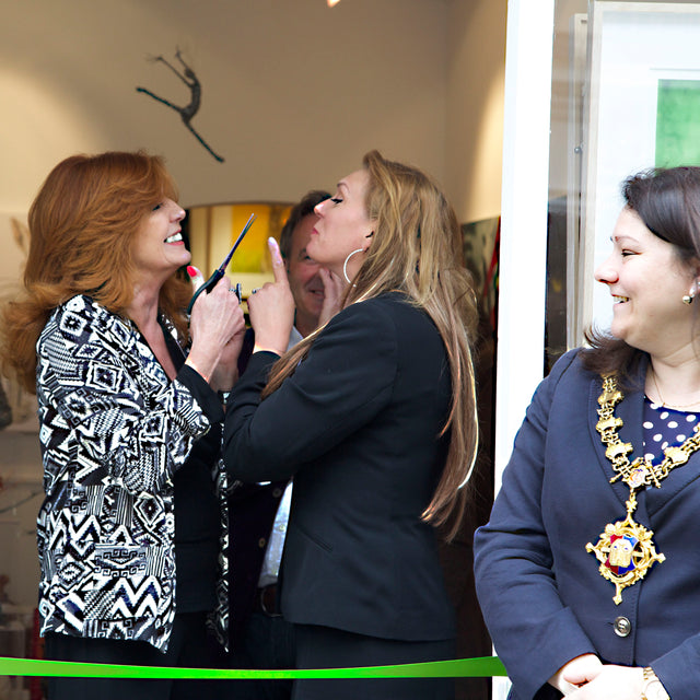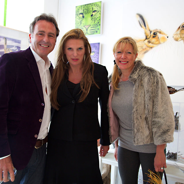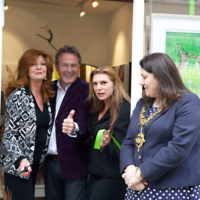 After a frantic three months in her Devizes gallery, it was officially opened with Paul Martin, presenter from BBC’s ‘Flog It’, and the Actress, Rula Lenska, cutting the ribbon at midday on Saturday 25th April 2015 along with the Mayor, Sarah Bridewell. Joanna’s paintings and cards including the latest Seasonal Hare collection were available. The beautiful wire sculptures by Rachel Ducker, ceramics and miniature hares from Pippa Hill, the ‘oh so collectible’, Loco Glassware and Amy Lancaster‘s hares made from garden implements and old farm machinery were also available. The opening was a huge success and a huge thank you to everyone that visited on the day, especially to Paul Martin, Rula Lenska and Sarah Bridewell for all their support and for making the day so much fun. Lots of unexpected sales were made, but to top it all, the original Red Leopard painting sold for ?10,000 along with hare prints, loco glassware, and Pippa Hill sculptures.